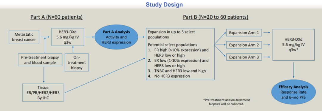 主要目标是评估客观缓解率(ORR)和6个月无进展生存期(PFS)。次要目标包括:HER3-DXd在MBC患者中的安全性和耐受性;MBC患者的反应持续时间(DoR)和PFS。