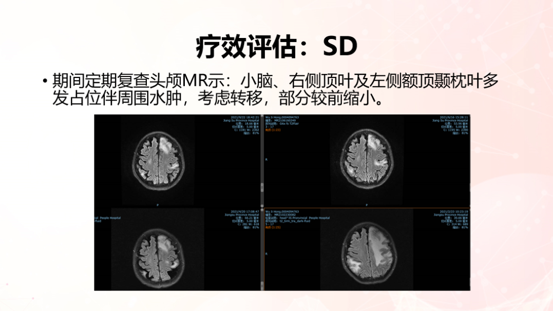 该患者为HER2+、初诊IV期的患者,对于这类患者晚期一线、二线及三线的治疗方案选择,三位教授都阐述了非常一致的意见。患者晚期一线、二线及三线得到了有效治疗,其中,该患者选择TKI+化疗作为晚期二线治疗方案,并在晚期三线治疗中做了非常正确的选择,选择DS-8201作为三线治疗方案,治疗了10个周期。目前患者颅内病灶稳定且部分病灶较前缩小,获得了较好的缓解。患者前期做过全脑放疗,后续没有再经过放射治疗,因此我们可以判定患者的颅内缓解主要是药物带来的缓解。这个病例的分享希望能给临床医生带来参考和借鉴。最后,再次感谢参与讨论的闫敏教授、王涛教授、林颖教授的精彩发言,也感谢参与网络投票和关注的各位专家和同行们。