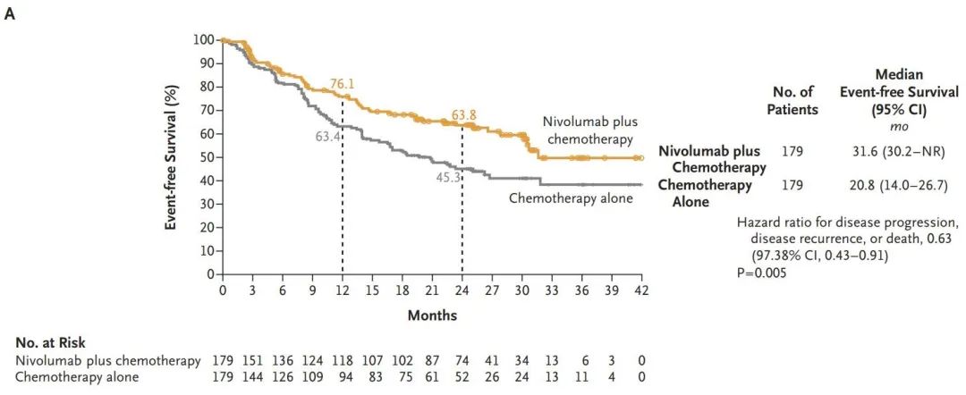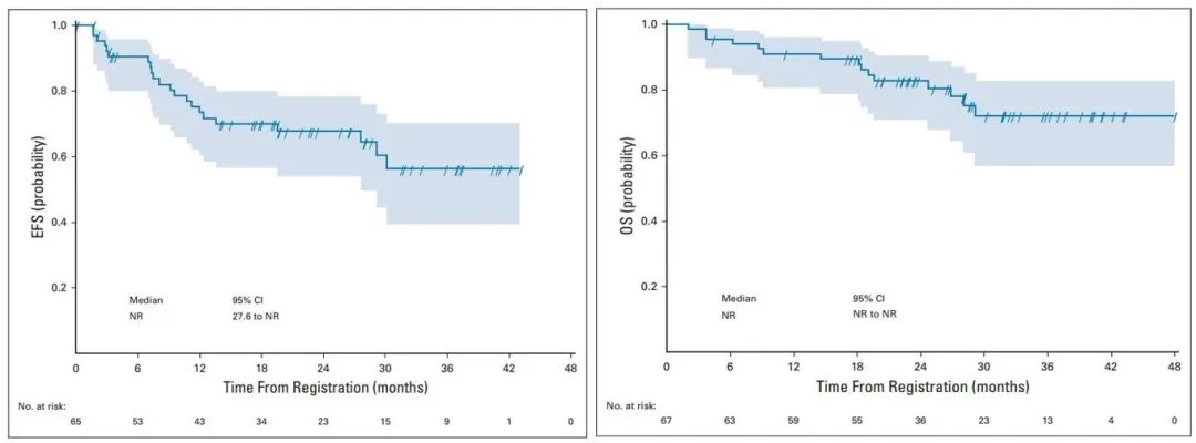 研究取得了非常瞩目的成果,结果多次在WCLC、ASCO等会议报道并最终发表于Lancet Oncology杂志。共计46例患者入组, MPR达到了83%,71%的患者出现完全病理缓解(定义为未找到肿瘤细胞),90%的患者分期下降。所有的患者均为R0切除,12个月PFS率为95.7%,18个月PFS率为87%,24个月的PFS率为77.1%,在修订的ITT人群中,12个月、18个月和24个月的OS率分别为97.8%、93.5%和89.9%。从安全性来看,全组3度及以上不良反应发生率为30%,在新辅助治疗阶段无不良反应导致治疗中止、手术延迟或死亡。在术后辅助治疗阶段,14%的患者因不良反应导致治疗终止。2021年WCLC,该研究公布了最新的研究数据,全组患者中位随访37.9个月,更新后的数据显示,14例患者出现疾病进展,9例患者出现疾病死亡,36个月和42个月的PFS率均为69.6%,36个月和42个月的OS率分别为91.0%和87.3%。