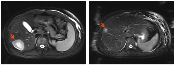 4.肝增强MRI:S6段 、S7段可见强化结节,小者长径为1.4cm(靶病灶3),大者为长径4.3cm(靶病灶4)。(图4)