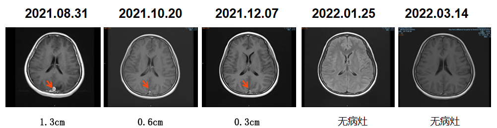 2.靶病灶2(脑转移病灶)评效:2周期部分缓解PR,4周期病灶持续缩小,评效PR,6-8周期病灶消失,疗效达CR。(图8)