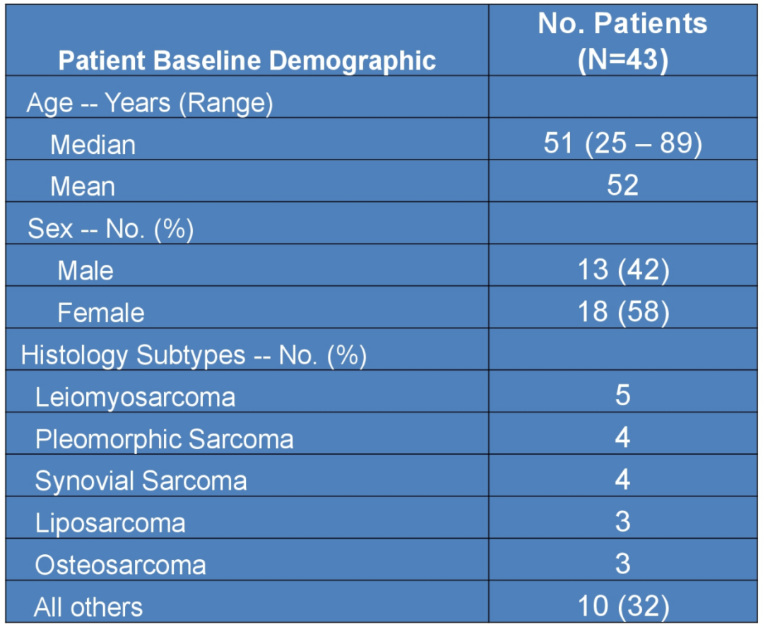 意向治疗人群(n = 43)的中期结果中,所有受试者均完成至少一个治疗周期,并在第6周进行了CT或MRI评效。本研究最常见的组织学亚型包括平滑肌肉瘤(n=15)、多形性肉瘤(n=4)、滑膜肉瘤(n=4)、脂肪肉瘤(n=3)、骨肉瘤(n=3)和其他(n=10)。