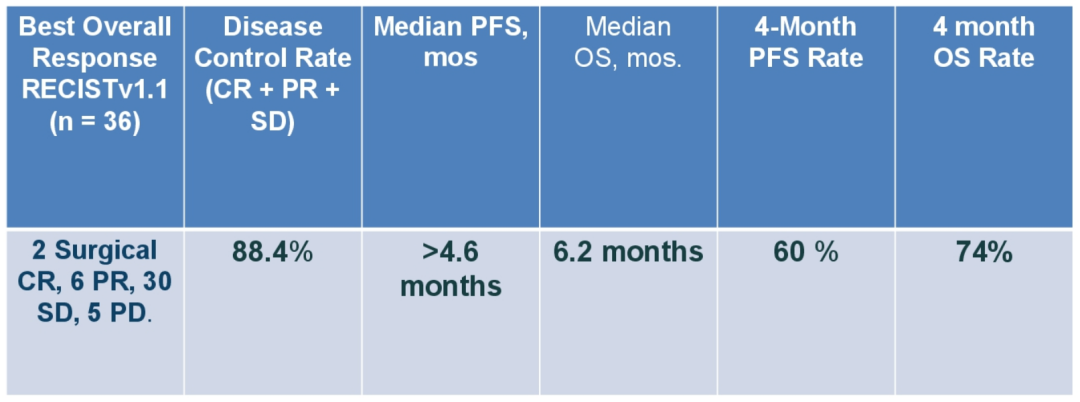 总体最佳疗效评价为:2例CR(经手术病理证实),6例PR,30例SD,5例PD。疾病控制率(CR+PR+SD)为88.4%。中位PFS>4.6(范围:1-27)个月;4个月PFS率为60%。中位OS为6.2个月,4个月OS率为74%。接受过前线治疗患者的中位PFS为2个月(范围:1-14)。