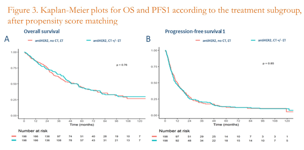 在多变量分析中,抗HER2+CT+/-ET并不优于抗HER2+ET(见下表),而TP双靶治疗优于T单靶治疗,通过使用倾向性评分对患者进行匹配,该结果得到确认(mOS P=0.76,mPFS1 P=0.85)。