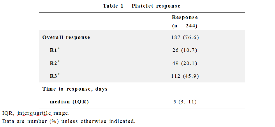 * Among patients who achieved response; R1: 30-49, R2: 50-99, R3: ≥100×109/L.