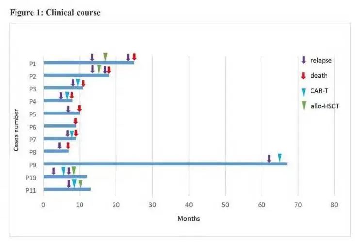 共随访11例患者,随访时间6-67个月(中位时间11个月),随访期间8例患者死亡。8/11例(72.7%)患者合并中枢神经系统白血病,3/11例合并纵膈占位病变。所有患者化疗后均复发,且肿瘤细胞倍增极快。6例患者进行了CD7-CART免疫细胞治疗,均于CART细胞输注后很快获得疾病缓解,但1例死于肺部严重感染,2例死于疾病复发。4例患者进行了异基因造血干细胞移植,其中2例挽救性移植,2例于CD7-CART缓解后桥接移植。截至随访日维持完全缓解的3个病例均接受了CD7-CART免疫细胞治疗,2例尽快桥接异基因造血干细胞移植。