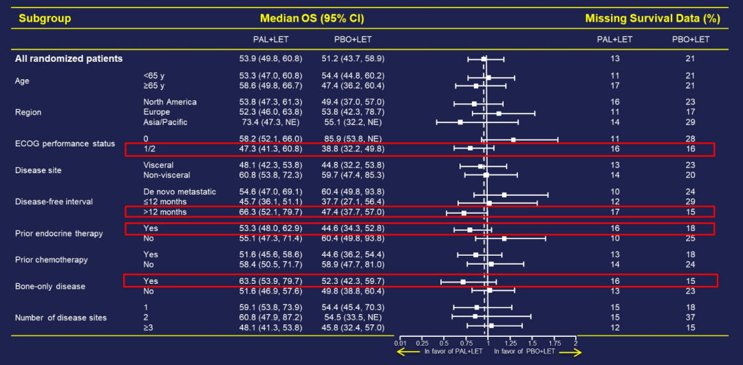 中位随访时间为90个月,PAL+LET组和LET组患者的中位OS没有显著差异(53.9 vs 51.2个月;HR 0.956,95%CI:0.777~1.177;P=0.3378)。排除掉撤出研究或失访患者(分别有21%和13%)的事后敏感性分析显示,PAL+LET组和LET组的OS分别为51.6个月和44.6个月(HR 0.869,95%CI:0.706~1.069)。