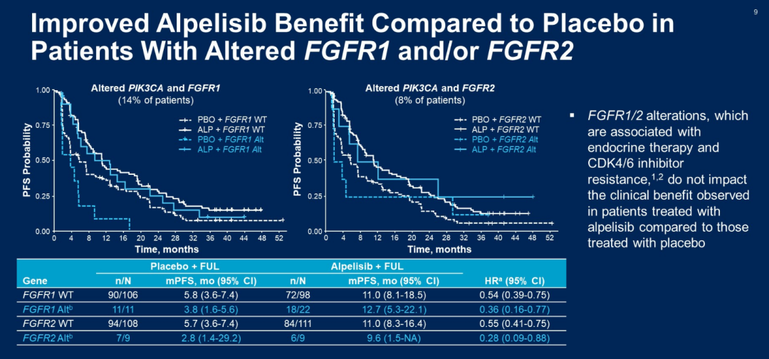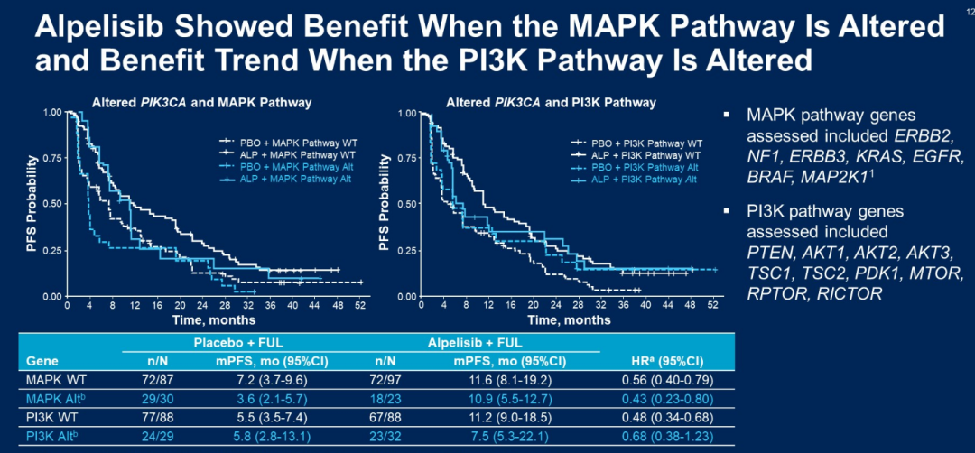 在MAPK通路改变(HR 0.43)、PI3K通路改变(HR 0.68)以及CDK4/6i耐药基因突变(HR 0.52)且同时携带PI3KCA突变患者中均可以看到alpelisib+氟维司群治疗的PFS获益。