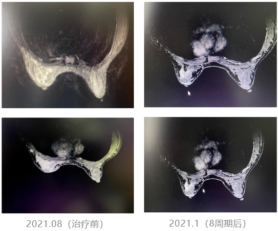 3、该患者在免疫组化结果出来前强烈要求行新辅助治疗,经讨论先行EC方案,待第二次化疗时根据免疫组化结果决定第五次是否行靶向HP治疗。免疫组化显示HER2阳性后决定继续行EC-THP方案治疗[1]。但治疗期间乳腺局部病灶及转移淋巴结持续缩小,化疗效果显著,遂于第5周期序贯THP方案直至8个周期后,病灶部位及腋下查体均阴性,乳腺增强MRI评估临床疗效为PR。新辅助化疗期间未出现与靶向药物相关的不良反应。由乳腺外科、肿瘤科、影像科等MDT联合讨论会诊后,决定行左乳癌改良根治术+腋窝淋巴结清扫术,术后病理显示pCR[2]。术后继续完善辅助放疗,抗HER2治疗及内分泌治疗至今[2]