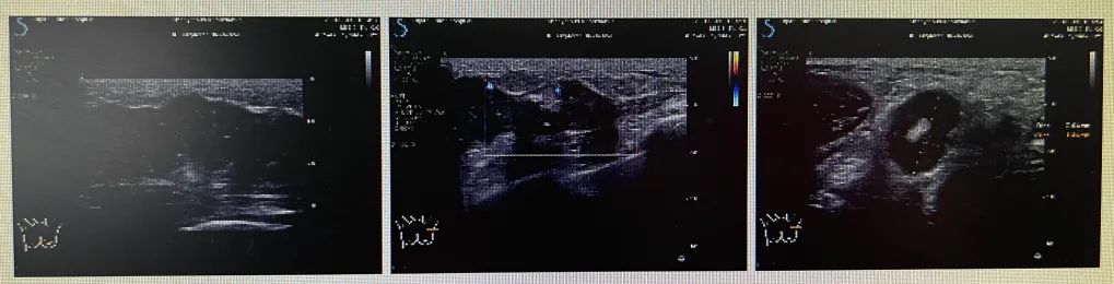 左侧腺体外上象限见一低回声团块,大约5.1cm×1.7cm×4.4cm,界欠清,形态不规则,边缘见毛刺及蟹足状改变,周边见高回声晕,内见强回声点,局部可见较丰富血流信号。左侧腋窝见数个淋巴结,大者约2.0cm×1.8cm,界清,可见淋巴门部结构,实质弥漫性增厚,可见较丰富血流信号。左侧锁骨下见数个淋巴结,大者约0.8cm×0.5cm,界清,未见淋巴门部结构,可见少量血流信号。