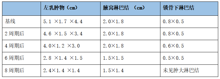 2021.8-2022.1开始给予EC-THP方案化疗(EC×4序贯THP×2+TH×2)患者由于经济原因,后续要求停用帕妥珠单抗,采用单靶治疗,彩超疗效评估(如下表格)