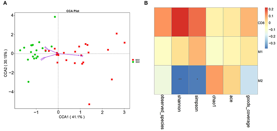 与HCC-NVI组相比,HCC-MVI组M2型肿瘤相关巨噬细胞(Tumour-associated macrophages,TAM)的百分比增加(P<0.001)。TME中M2型TAM与HCC-MVI肠道菌群的Shannon和Simpson指数呈负相关(均P<0.01)。