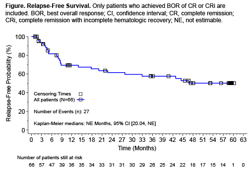 35例ND Ph+ALL患者中,12例入组时为CR(包括2例CMR)。23例可评估患者中22例(96%)达到CR/CRi。1例患者因招募前的化疗导致颅内出血于第18天死亡。1个周期后21/33例患者(64%)达到CMR,任何时间总共28/33例患者(85%)达到CMR。11/15例检测MRD的患者(73%)MRD阴性,MRD检测采用NGS分析,敏感度1×10-6。