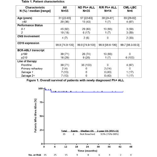 在2年时间内,入组了55例患者,其中35例为新诊断(ND)费城染色体阳性(Ph+)ALL、14例为复发或难治(R/R)Ph+ALL及6例慢粒急淋变(CML-LBP)患者,结果显示:1)对于新诊断的Ph+ ALL患者而言,在可评估疗效的患者中有96%达到完全缓解或血象未完全恢复的完全缓解(CR/CRi),1个治疗周期的完全分子缓解(CMR)为64%;而任何时间的CMR更是高达85%。2)对于复发/难治Ph+ ALL患者而言,14例患者中共有13例可进行分析,其中12例(92%)达到了CR/CRi,1治疗周期后的CMR为71%,任何时间的CMR同样高达79% 。3)6例慢粒急变(CML-LBP)患者中5例达到CR/CRi,CMR为40%。4)在生存方面, ND Ph+ALL患者中,2年EFS和OS率均为93%;R/R Ph+ALL患者中,2年EFS率42%,2年OS率61%;CML-LBP患者中,2年EFS率33%,2年OS率60%。