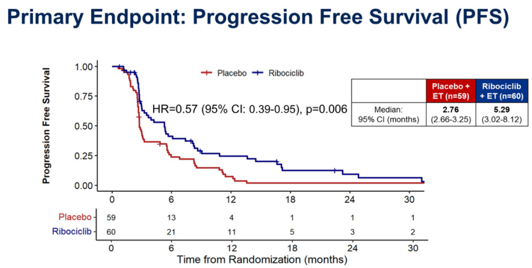 MAINTAIN研究主要针对CDK4/6抑制剂治疗进展后的HR+/HER2-晚期乳腺癌患者。该研究共入组了120例患者,并将患者按照1:1比例进行分配,后续分别给予更换内分泌联合瑞博西利治疗或更换内分泌联合安慰剂治疗。结果显示,与接受安慰剂联合内分泌治疗的患者相比,瑞博西利联合内分泌治疗患者的PFS显示出了具有统计学意义的改善(5.29个月vs.2.76个月),HR=0.57(95%CI:0.39~0.95),P=0.006。这些数据也证实了对于CDK4/6抑制剂治疗失败后的患者,再次使用CKD4/6抑制剂(瑞博西利)仍能使患者获益。