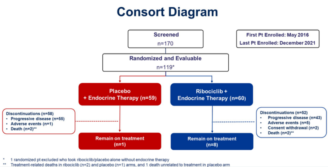 The MAINTAIN trial was a randomized trial that looked at patients with hormone receptor positive,HER2-negative metastatic breast cancer,who have had tumors that have had progressed on,at least any CDK4/6 inhibitor and any endocrine therapy.Then randomized patients in a 1 to 1 fashion to switching endocrine therapy plus ribociclib versus switching endocrine therapy plus placebo.This total sample size was 120 patients.