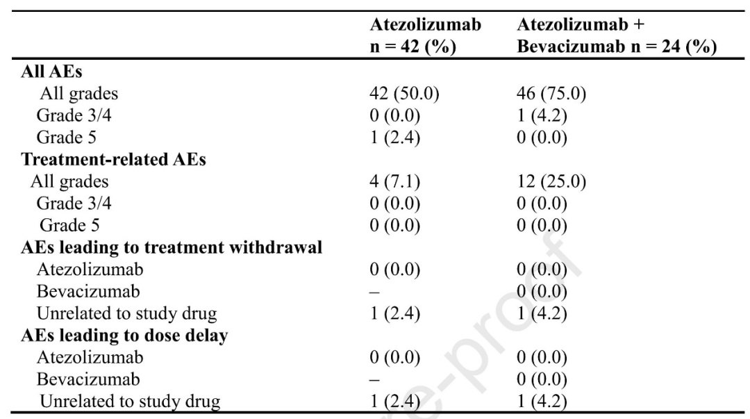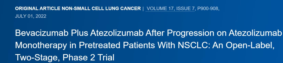 贝伐珠单抗是一款针对VEGF的单克隆抗体,可抑制肿瘤血管生成及肿瘤生长,在多种实体瘤中显示了抗肿瘤治疗效果。临床前研究数据显示,抗血管生成治疗与免疫治疗联合可有效抑制肿瘤细胞增长。阿替利珠单抗与贝伐珠单抗的联合在肾细胞癌以及肝细胞癌中显示了良好的疗效,而IMpower-150研究则奠定了阿替利珠单抗联合贝伐珠单抗联合细胞毒类化疗,在驱动基因突变阴性患者的一线治疗地位。免疫检查点抑制剂耐药后,阿替利珠单抗联合贝伐珠单抗能否给患者带来进一步的获益尚不明确。近期,JTO杂志发表的一项小型II期临床研究发现,这一联合治疗策略或许值得进一步分析。