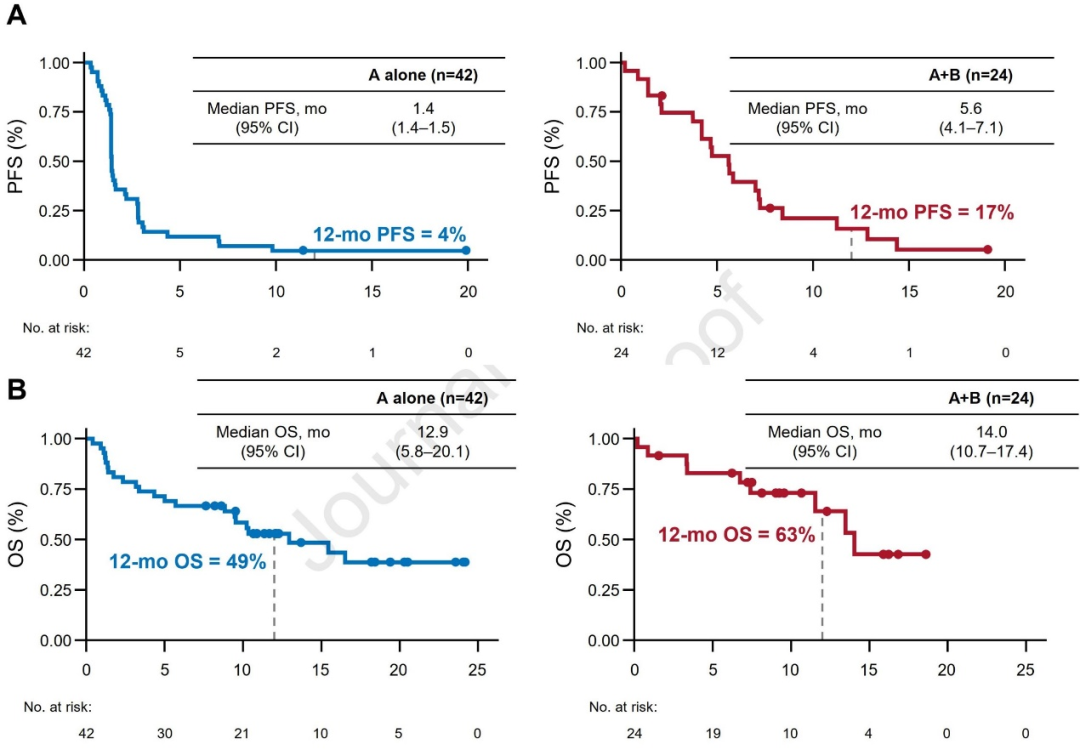 在第II阶段,中位PFS和OS分别为5.6个月和14.0个月,12个月OS率63%,2例患者在出现影像学进展后,继续接受联合治疗超过6个月;在第I阶段,分别有1例和14例患者疾病评估为PR和SD,DCR为35.7%,中位PFS为1.4个月,临床获益率(定义为SD时间超过6个月)为41.7%;