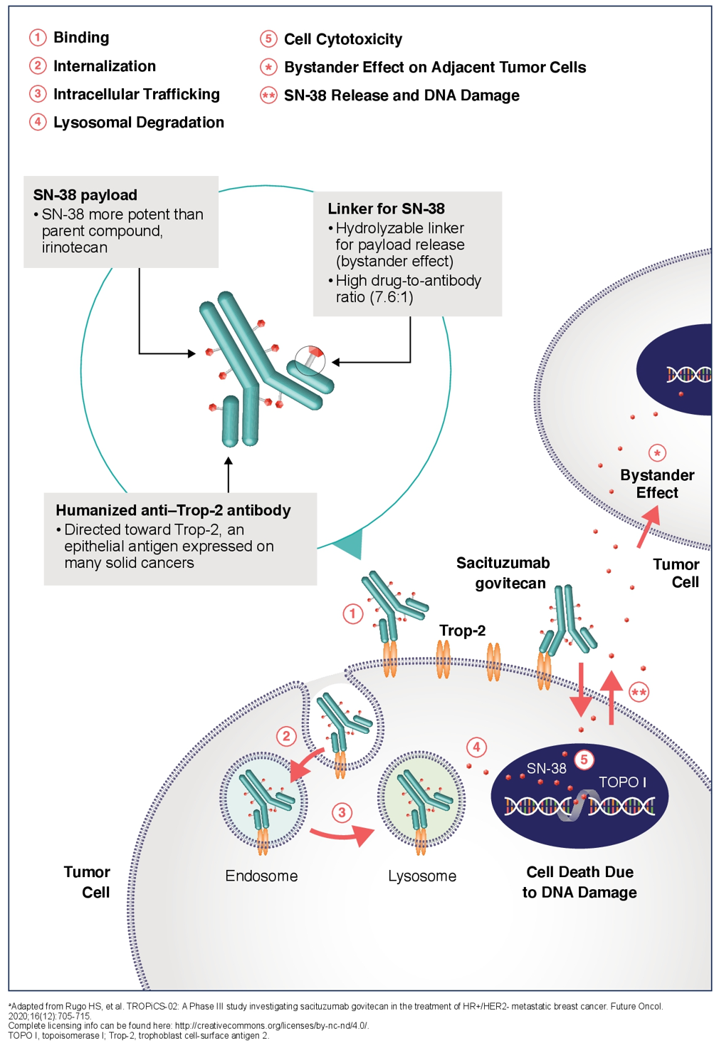 在众多治疗UC的ADC中,SG是全球首款靶向Trop-2的ADC药物,并已于2021年4月获得FDA批准用于铂类和免疫治疗进展后的mUC。SG靶向的Trop-2是UC的理想靶点,在mUC的中表达率高达94.6%[4],因此无需检测生物标志物即可广泛应用。SG的载荷药物SN-38是伊立替康盐酸盐(CPT-11)的生物活性代谢物,其引起DNA拓扑异构酶I的抑制作用是伊立替康的100-1000 倍,与传统化疗交叉耐药可能性小,作用强大。SG的连接子CL2A在血液环境中具有良好的稳定性,可在肿瘤细胞溶酶体的作用下以及在肿瘤微环境中裂解发挥“旁观者效应”,高达7.6:1的药物抗体比会进一步扩大该效应,发挥更强大的抗肿瘤作用。霜刃砺出,一场全面针对UC的狩猎已然展开!