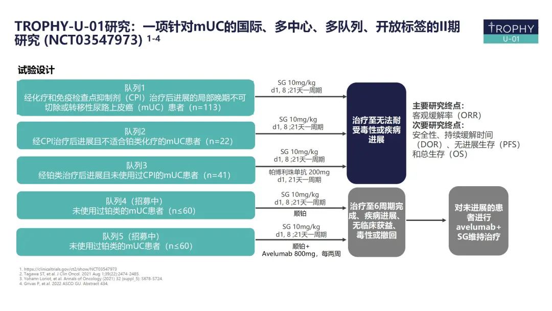 在mUC的治疗中,含铂一线化疗的中位生存期(mOS)约15个月[5],免疫治疗客观缓解率(ORR)仅为20%左右[6],适用人群较窄。SG在铂类和免疫治疗进展后mUC适应症的获批极大纾解了这一困境,该适应症的获批主要基于II期TROPHY-U-01研究队列1的惊艳结果。TROPHY-U-01研究是一项全球多队列、开放标签的2期试验,具体队列设计如图所示,其中队列1-3主要针对mUC后线治疗。