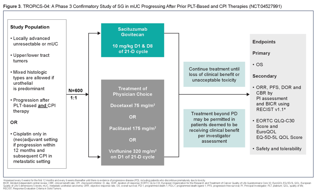 一箭开石,四座皆惊,更多后线治疗的研究风驰电掣般设立,助力SG在mUC后线治疗取得更大突破。在II期TROPHY-U-01研究队列1优秀结果的基础上,Ⅲ期TROPiCS-04研究(NCT04527991)继续开拓SG单药的应用前景,该研究计划纳入含铂化疗及CPI经治后进展的mUC或局部晚期UC患者600例,按1:1随机后对比SG单药或医生选择的化疗方案(TPC,紫杉醇、多西他赛或长春氟宁单药)的疗效与安全性。目前国内入组顺利,期待该研究结果的早日公布[10]