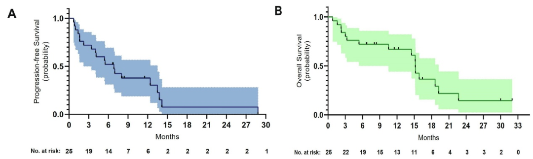 疗效:25例患者中,7例患者达到PR,无CR患者出现,ORR为28%,另有13例(52%)患者评估SD,DCR为80%;16%的患者由于在首次评估之前出现症状恶化,疗效不可评估。患者中位DOR为5.3个月。数据分析时,5例患者仍然在组治疗,80%的患者瘤体出现不同程度的缩小。一线或后线接受这一治疗策略,患者的疗效并无区别,ORR分别为31%和25%,P=0.464。3例基线有脑转移的患者,脑转移病灶均显示了缩小,2例患者脑转移病灶可评估,病灶分别缩小4%和40%。第3例患者脑转移病灶为非靶病灶。数据分析时,20例患者出现疾病进展或死亡事件出现,中位PFS为6.8个月,中位OS为15.2个月,C-螺旋区或环状区的疗效无明显区别。疗效最长的患者,PFS为16.4个月,其突变类型为A763_Y764insFQEA。