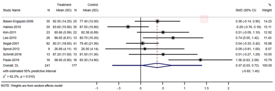 为了评估诊断后锻炼对乳腺癌幸存者身体功能的影响,研究者纳入了241名运动干预参与者和177名对照组参与者的数据。干预期结束时,运动组与对照组的差异有统计学意义(SMD=0.37,95%CI:0.03~0.72,P=0.032),具有中度统计异质性(P=0.01,I2=62%)。