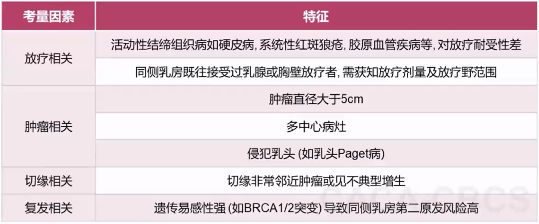 介于适应证和绝对禁忌证之间的相对禁忌证,往往是需要医生和患者充分沟通的情况,包括放疗、肿瘤、切缘、复发等相关因素,比如活动性结缔组织并、多中心病灶、乳头Paget病、切缘不典型增生等。当然,这些情况的保乳手术往往是“双向选择”,一是医生是否有把握,二是患者是否有意愿。除了肿瘤安全性以外,也有一些患者因为无法达到美容外观而放弃保乳。近年来,肿瘤保乳整形手术(OPS)能够这些患者实现更完美的保乳,CBCS指南也推出了OPS决策流程的小程序。从这个角度来看,OPS能够为相当一部分相对禁忌证的患者提供新的保乳支持,有助于进一步提高我国的保乳率。