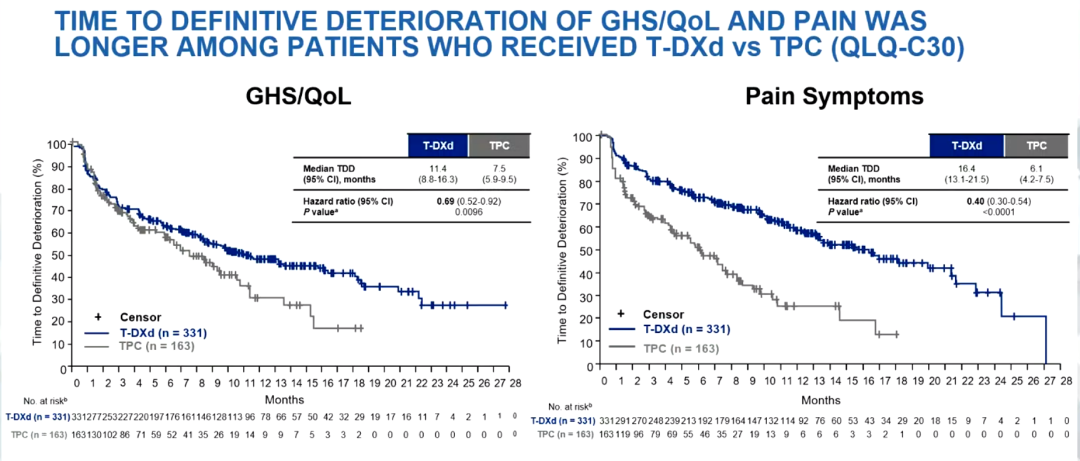 T-DXd组的中位QLQ-C30 GHS/QoL至明确恶化时间(TDD)为11.4个月,而TPC为7.5个月(HR 0.69,95%CI:0.52~0.92;P=0.0096)。在QLQ-C30子量表中:T-DXd组和TPC组的疼痛TDD分别为16.4.个月和6.1个月(HR 0.40,95%CI:0.30~0.54,P<0.0001);此外,T-DXd组的躯体功能(HR 0.53)、情绪功能(HR 0.69)、社会功能(HR 0.59)、疲劳(HR 0.61)TDD均相较于TPC有显著获益。