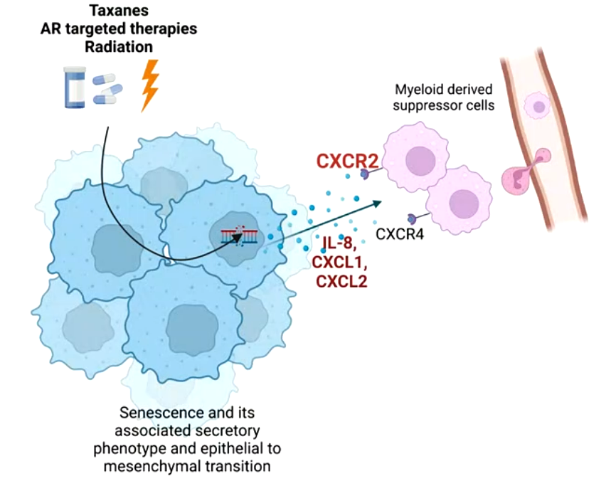 肿瘤浸润性髓样细胞可驱动转移性去势抵抗性前列腺癌(mCRPC)的生长和治疗耐药,部分通过IL-23和NRG1分泌。在前列腺癌模型中,通过破坏CXCR2受体轴抑制髓样细胞浸润可以逆转恩扎卢胺(ENZA)耐药性。AZD5069是一种选择性CXCR2拮抗剂。