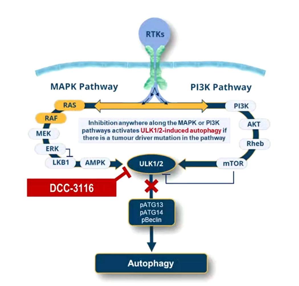 丝裂原活化蛋白激酶(MAPK)通路抑制激活Unc-51样自噬活化激酶(ULK)1/2,并启动自噬以促进RAS/RAF突变癌的存活。DCC-3116是第一种有效的选择性ULK抑制剂,与MAPK通路抑制剂联合使用显示出临床前抗肿瘤活性。