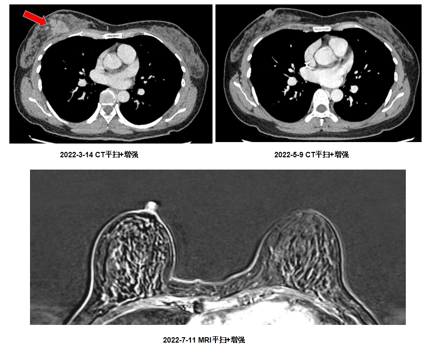 2周期 2022-5-9 CT平扫+增强提示:右乳未见明确肿块影。