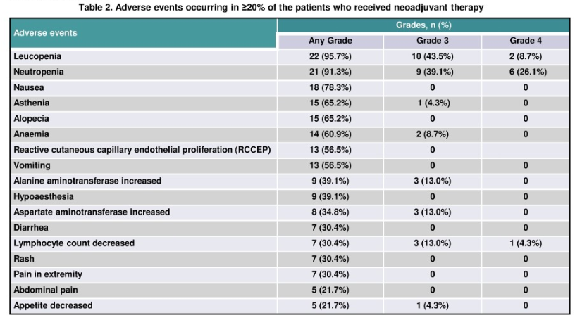 从2020年6月到2021年8月,有23名患者入选。在20名可评估疗效的患者中,16名(80%)有淋巴结转移。tpCR率为65%(13/20),bpCR率为70%(14/20)。新辅助治疗结束时的ORR为95%(19/20)。