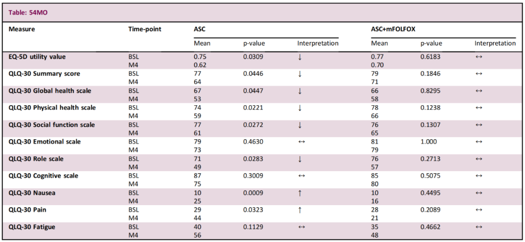 2022年ESMO年会研究组报道了QoL(QLQ-30、QLQBIL21)和V-He (Euroqol EQ5D)基线和治疗12周后的调查问卷。符合分析的138例患者(ASC+FOLFOX组73例,ASC组65例)从基线到第4个月随访的结果表明在ASC的基础上加入FOLFOX方案未导致QoL参数的恶化,而与此相反的是ASC组患者EQ-5D值和大部分QLQ-30量表恶化,在ASC+FOLFOX组稳定的恶性和疼痛症状也恶化。