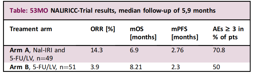 研究结果:共100例受试者在17个德国中心被随机分组,其中nal-IRI/5-FU/LV组49例,5-FU/LV组51例。分别有64/19/17例患者患有肝内/肝外/胆囊癌。两组间患者特征平衡良好。试验结果见下表。nal-IRI/5-FU/LV组最常见的≥ 3级不良事件为中性粒细胞计数下降(16.6%)、腹泻(14.6%)和恶心(8.3%)。5-FU/LV组中27.5%的患者在进展后接受伊立替康治疗。两组生活质量相似。