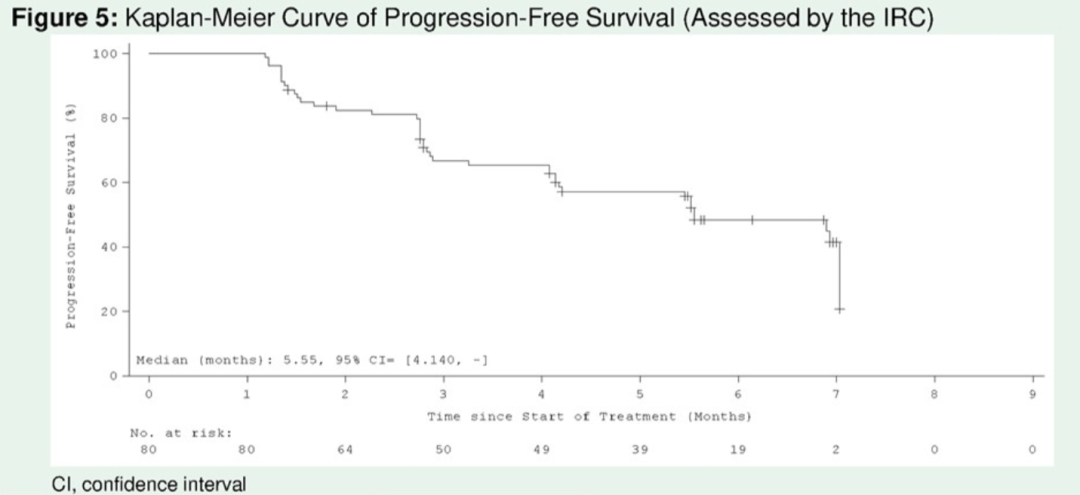 中位到疾病缓解时间(mTTR)为1.51个月,mDOR 5.59个月(95%CI: 5.585-NA),mPFS 5.55个月(95%CI: 4.140-NA),6个月PFS率为48.3%(95%CI: 36.15-59.51),OS尚不成熟。