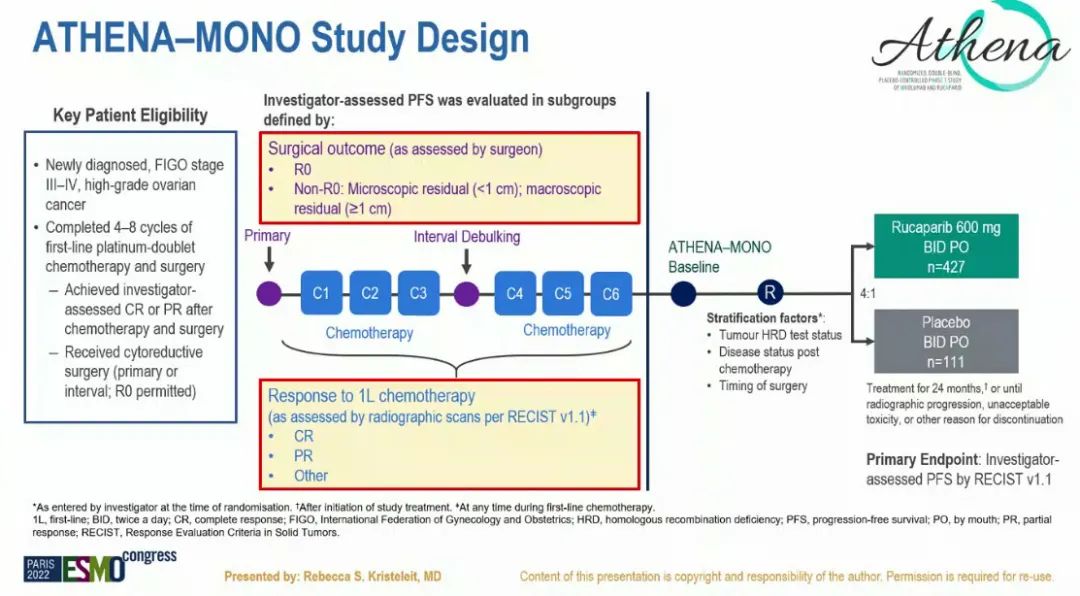 ATHENA-MONO试验的目的是在新诊断的卵巢癌患者中评估rucaparib组和安慰剂组的PFS。符合研究入组条件的患者为FIGO III-IV期、新诊断、高级别卵巢癌患者,需要完成4-8个周期的一线铂类双药化疗和手术治疗。在初始治疗后,患者需要达到完全缓解(CR)或部分缓解(PR),并接受肿瘤细胞减灭术。分层因素包括同源重组修复缺陷(HRD)状态、一线化疗后疾病状态和手术时机。患者按4:1随机分组,每天两次口服rucaparib 600mg(n=427)或安慰剂(n=111)治疗,持续24个月或直至影像学进展、不可接受的毒性或其他原因停药。