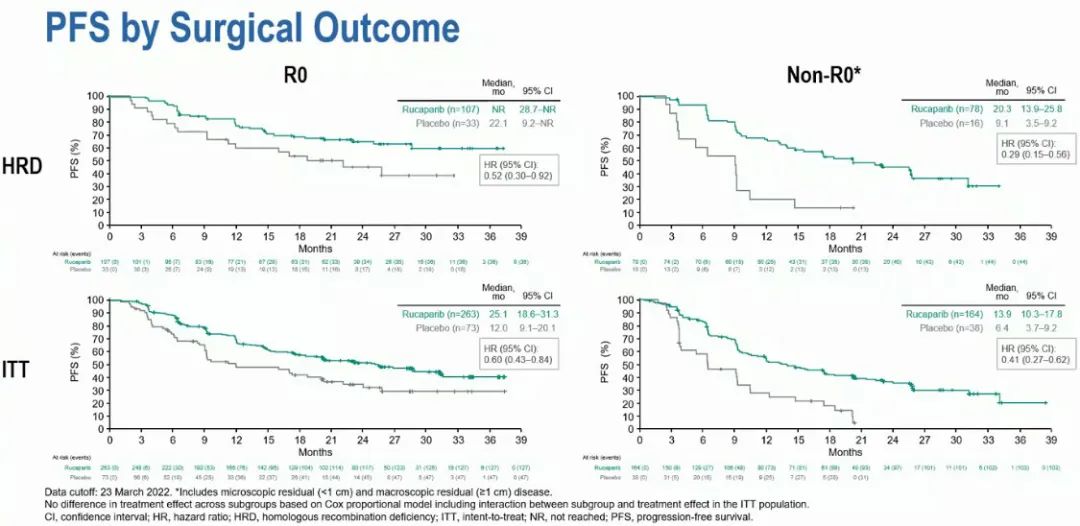 根据外科医生评估的手术结果进行分层,评估患者的PFS。在R0手术切除且存在HRD的患者中,使用rucaparib和安慰剂治疗的中位PFS分别为未达到(NR; 95% CI: 28.7-NR)和22.1个月(95% CI: 9.2-NR)(HR=0.52; 95% CI: 0.30-0.92)。在达到R0切除的意向治疗(ITT)人群中,中位PFS分别为25.1个月(95% CI: 18.6-31.3)和12.0个月(95% CI: 9.1-20.1)(HR=0.60; 95%CI: 0.43-0.84)。