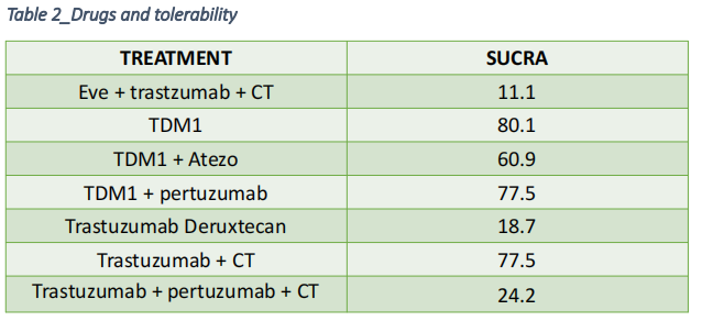 在网状meta分析中,H+CT与T-DM1或T-DM1+Atezo之间没有显著差异,但H+CT与H+P+CT(RR 0.04,95%CrI:0.01~0.34)、T-Dxd(RR 0.03,95%CrI:0.00~0.56)和Eve+H+CT(RR 0.02,95%CrI:0.00~0.08)相比,风险比显著降低。