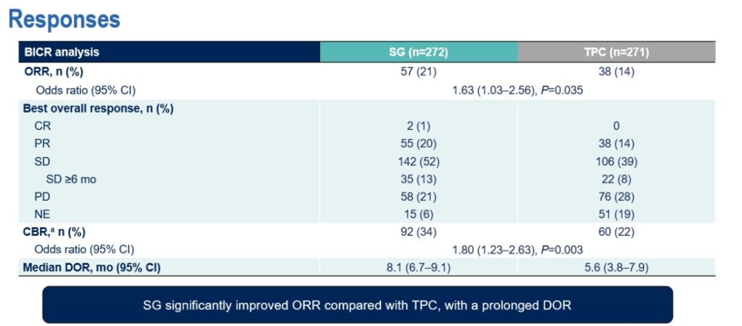 SG组对比TPC治疗组显著改善了患者的ORR,且显著延长DOR。两组的ORR为57%vs 38%,(OR=1.63,95%CI:1.03~2.56,P=0.035),两组的中位DOR为8.1 vs 5.6个月。