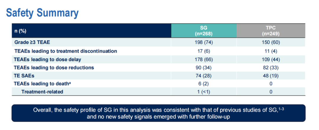 截止到2022年7月1日(中位随访12.5个月),有390例OS事件发生。SG组与TPC组相比,OS、ORR、生质量以及疲劳感均有显著改善。SG的安全性与既往研究一致,未发现新的安全性问题。