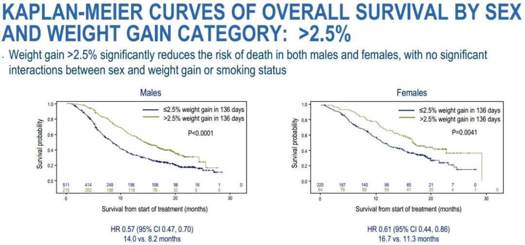 对比体重增加>2.5%vs≤2.5%的患者,体重增加>2.5%使男性患者的OS(14.0 vs 8.2个月;HR=0.57;P<0.001)和女性患者的OS(16.7 vs 11.3个月;HR=0.61;P=0.0041)均有所改善。