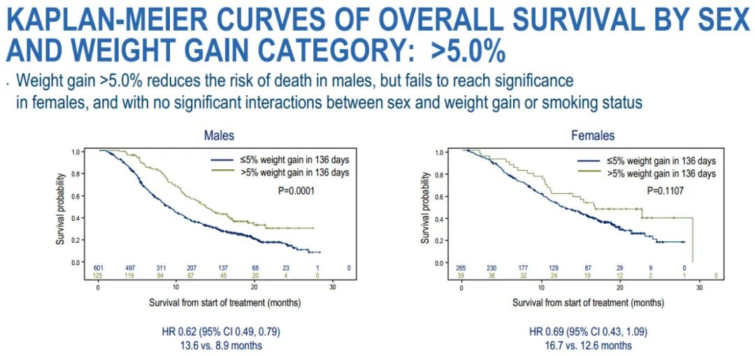 对比体重增加>5%vs≤5%的患者,体重增加>5%使男性患者的生存改善(13.6个月vs 8.9个月;HR=0.62;P=0.0001),但在女性患者中OS增幅未达到统计学意义(16.7个月vs 12.6个月;HR=0.69;P=0.1107)。