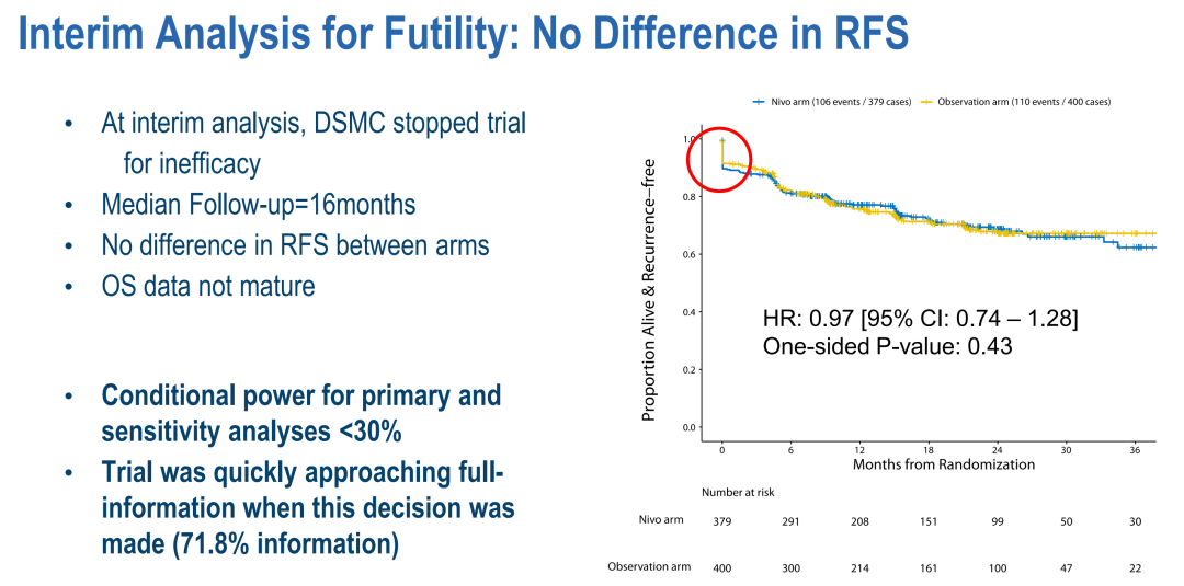 共有819例患者被随机分配至nivo围术期治疗组(404例)和单纯手术组(415例)。入组时的临床分期为cT2占53%、cT3-4占47%、cN1占17%和cM1占4%;83%的患者为透明细胞肾细胞癌。两组均有约为12%的患者未能完成手术,提前出组。由于治疗无效,该研究提前终止。两组之间的RFS相似(HR 0.97;95%CI:0.74~1.28;P=0.43)。OS均尚未成熟,但在研究组之间无统计学差异(HR 1.48;95%CI:0.89~2.48;P=0.93)。接受nivo治疗的患者中,20%的患者至少经历了一次可归因于nivo的3-4级不良事件,而对照组中为6%。