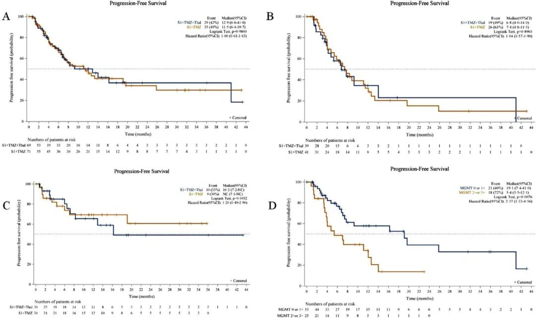 至数据截止日期(中位治疗时间分别为5.4个月和6.0个月),在ITT人群中,S1+TMZ+Thal组和S1+TMZ组的中位PFS分别为12.9个月和11.5个月(HR 1.00,95%CI:0.61~1.63);S1+TMZ+Thal组的1、2、3和4年PFS率分别为50.0%、36.7%、36.7%和18.4%,S1+TMZ组分别为48.2%、34.0%、29.8%和29.8%。