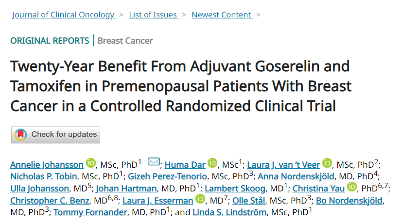 编者按:基于SOFT/TEXT研究,5年OFS+TAM或AI已经成为绝经前HR阳性早期乳腺癌患者的标准治疗,而在此之前开展的斯德哥尔摩他莫昔芬STO-5试验显示2年的GnRH+TAM并未较单药治疗显著改善患者生存率。尽管该研究开展已经超过30多年,近日JCO杂志发表了STO-5的二次分析,评估了患者的20年长期治疗获益情况,结果显示即便2年疗法,仍可降低长期的远处复发转移风险。
