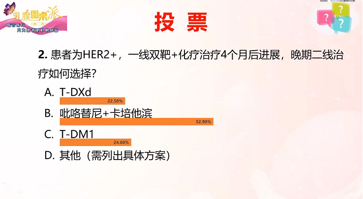 网上医生投票结果揭晓:可能是考虑到药物可及性的问题,52.9%的网上医生选择了吡咯替尼+卡培他滨,22.5%选择了T-DXd,还有24.6%选择T-DM1。