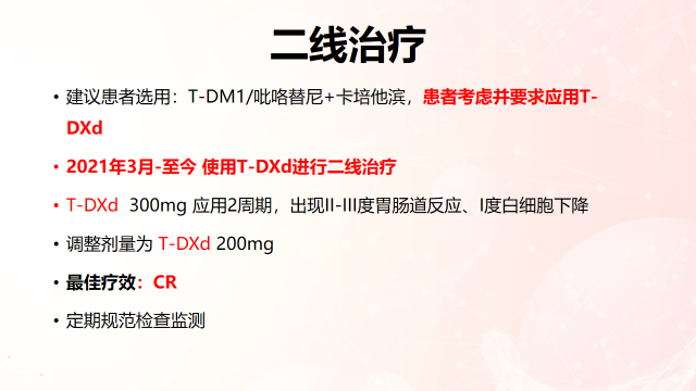 王殊教授:这是一个开放性问题,目前没有标准答案。患者之前的治疗都是用的大分子药物,无论是ADC药物,还是曲帕双靶联合化疗,所以如果没有其他靶点,还要继续在抗HER2的道路上走下去的话,我会加上TKI药物。当然如果有其他新型的ADC药物或新的靶点药物可供选择的情况下,那将是一个更精准的指引,在当前没有新的ADC和靶点的情况下,我会把TKI加上。