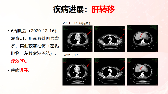 姚静教授:我认为目前患者的病例资料不够完整,首先该患者双侧均有肿物,然而只做了左乳肿物的穿刺活检,右侧乳腺肿物只有彩超检查,彩超示BI-RADs:5类,右乳腺肿物及肝脏占位均未行穿刺活检。那么,有没有可能是双乳癌伴肝转移?且肝脏转移灶来源于左乳还是右乳?一线治疗时,期间肝脏转移灶最佳疗效达到PR但后续进展,那么这个PD是肝脏的新发病灶还是后续进展病灶,这几个点是不清楚的。如果是新发病灶我认为还是要对肿物和转移灶进行穿刺,确定其病理类型后,再决定下一步的治疗方案。