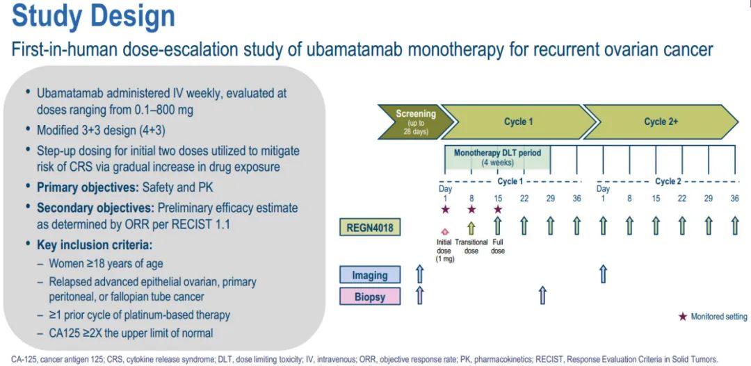 Ubamatamab是一种靶向CD3与MUC16的双特异性抗体。该研究是首次在18岁以上复发晚期上皮性卵巢癌、原发性腹膜癌或输卵管癌患者中评估了剂量递增单药方案的人体试验。入组患者接受至少过1线铂类为基础的化疗,CA-125至少为正常值上限2倍。该试验采用改良的3+3设计,患者每周静脉注射一次剂量0.1 mg~800 mg剂量的ubamatamab。在最初的2次给药时剂量逐步增加,以降低细胞因子释放综合征(CRS)的风险。试验的主要终点是安全性和药代动力学。次要终点包括基于RECIST v1.1标准评估的客观缓解率(ORR)进行初步疗效评估。